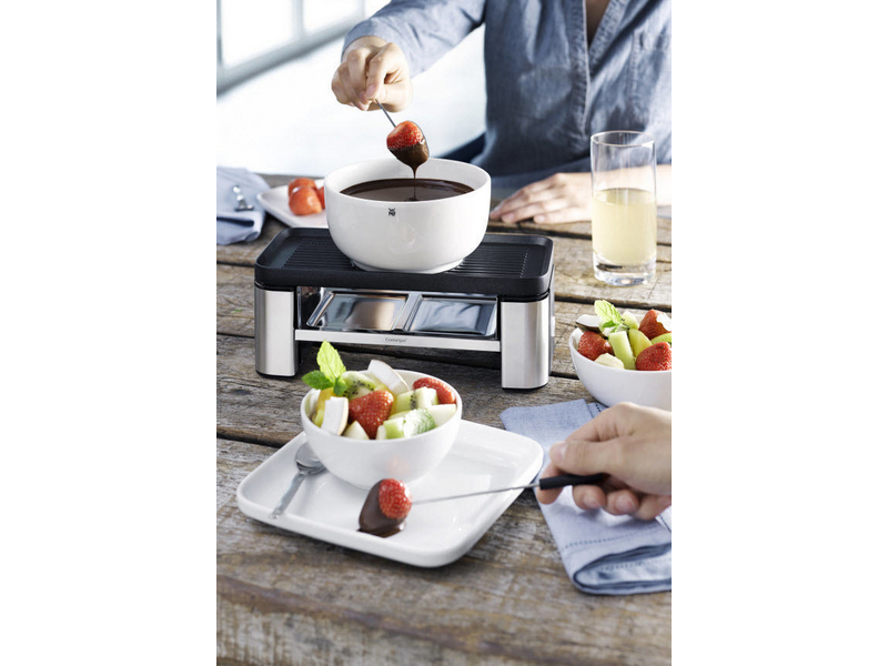 Platzsparend, kompakt und clever. Mit dem WMF Raclette für zwei aus matten Cromargan gelingt ein gemütliches «Dinner for Two.» Nicht immer trifft man sich in großen Gruppen, um ein leckeres Raclette zu genießen. Mit dem WMF KÜCHENminis Raclette für Zwei müssen auch kleine Runden nicht mehr auf diesen Genuss verzichten und können ein romantisches Dinner für Zwei genießen. Süßer Mehrwert: Auf der Grillplatte aus Aluminium Druckguss kann man sich in der mitgelieferten Schale zusätzlich ein feines Schokoladenfondue zubereiten. Dazu gibt es für das Schokoladenfondue eine Keramik-Schüssel und zwei Cromargan® Spieße. Größere Portionen wie Spiegelei oder Toast Hawaii, Spargel, Lauch oder Karotten passen alternativ in das Maxi-Pfännchen. Alle Komponenten sind hygienisch in der Spülmaschine zu reinigen.